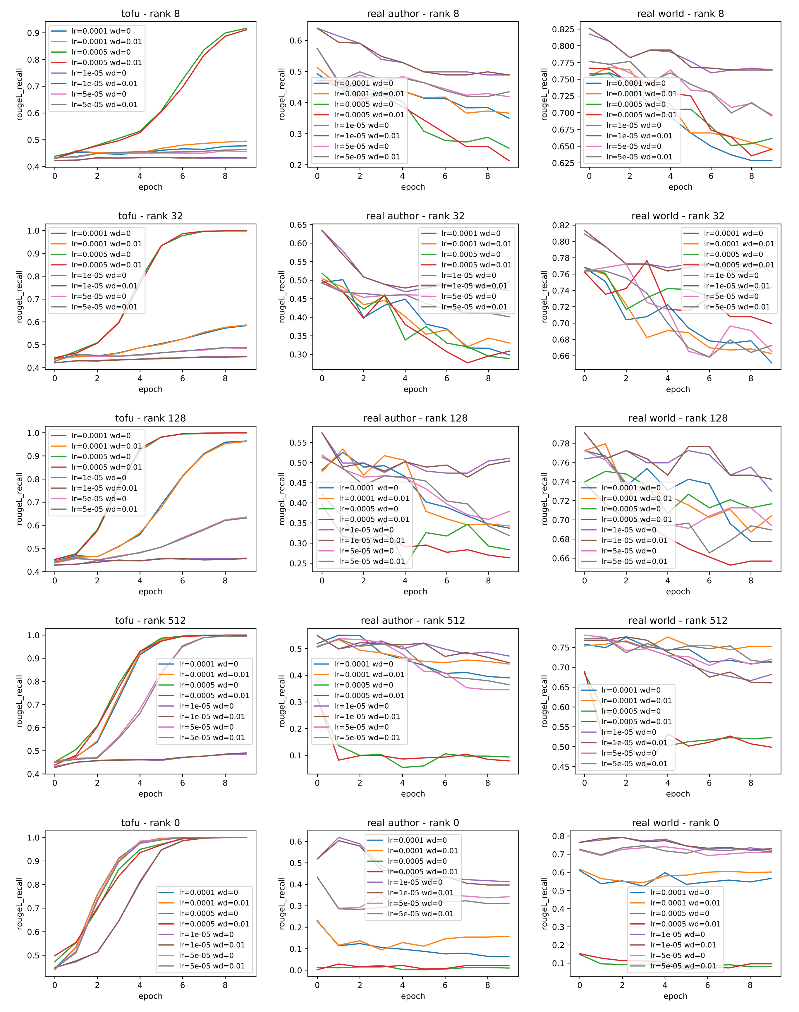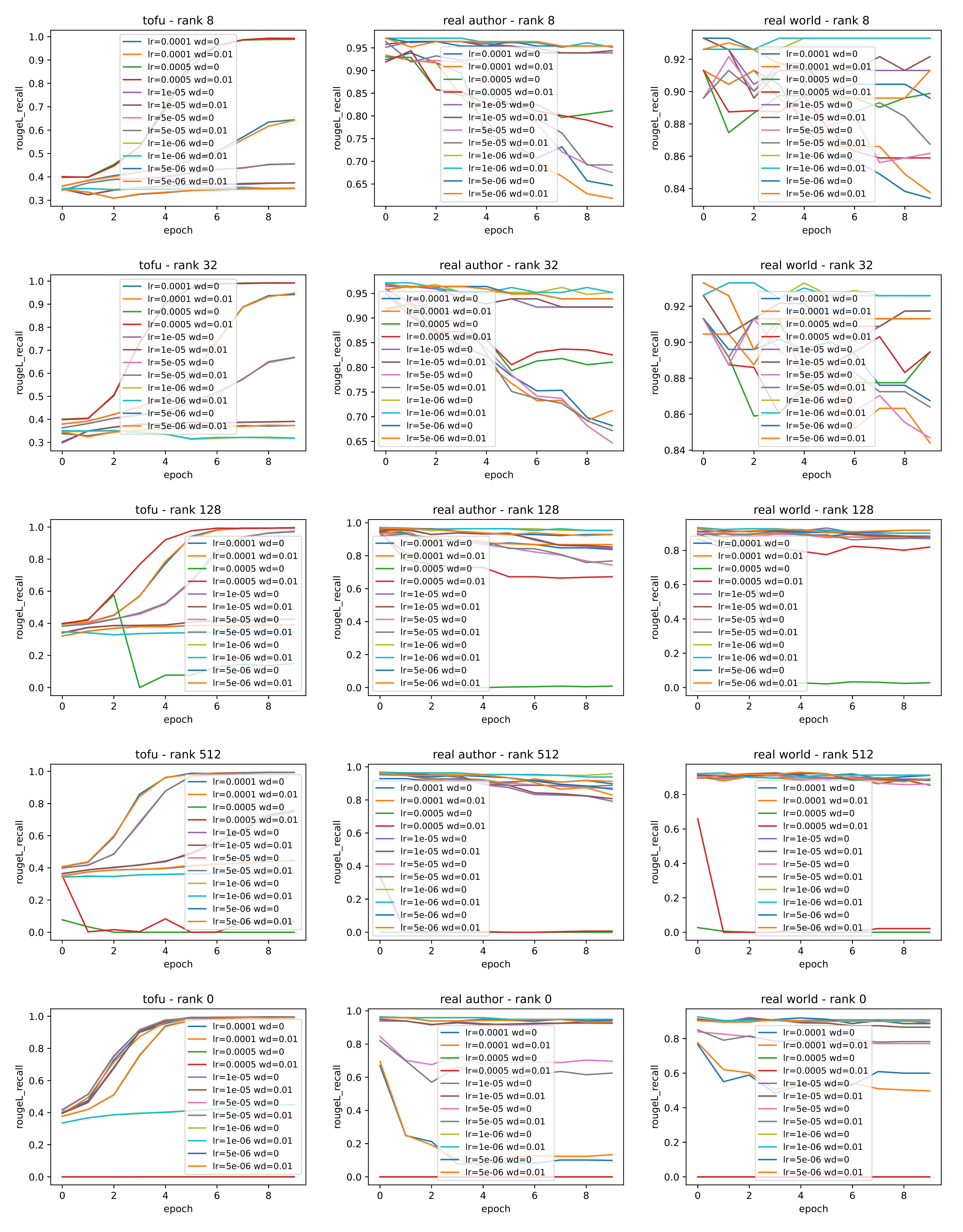 \[R_{\text{truth}} = \frac{\frac{1}{|\mathcal{A}_{\text{pert}}|}\sum_{\hat{a}\in\mathcal{A}_{\text{pert}}}P(\hat{a}|q)^{1/|\hat{a}|}}{P(\tilde{a}|q)^{1/|\tilde{a}|}}, \quad \text{Truth ratio} = \text{max}(0, 1-R_{\text{truth}}).\]Following the above procedures, for each rank \(r\), we fine-tune Phi-1.5B on TOFU (i.e., new author knowledge) with a sweep over the hyperparameters, including learning rate (LR) and weight decay (WD). The ROUGE score on new author knowledge throughout training is reported in the first column of Figure 1. Additionally, we evaluate the models’ performance on old author knowledge and old world knowledge throughout training and report them in the second and third columns of Figure 1.