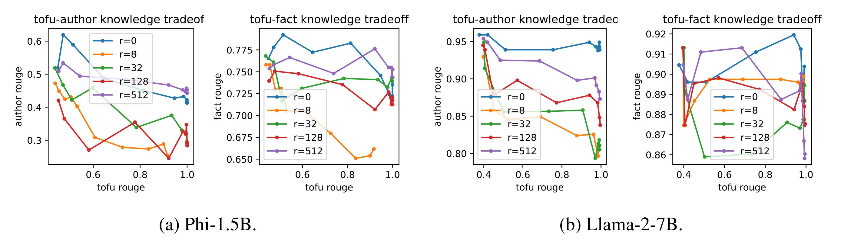 In Figure 3, we plot the ROUGE score for new knowledge on the x-axis and that for old knowledge on the y-axis for different ranks \(r=\{8,32,128,512,\text{full}\}\). We observe that