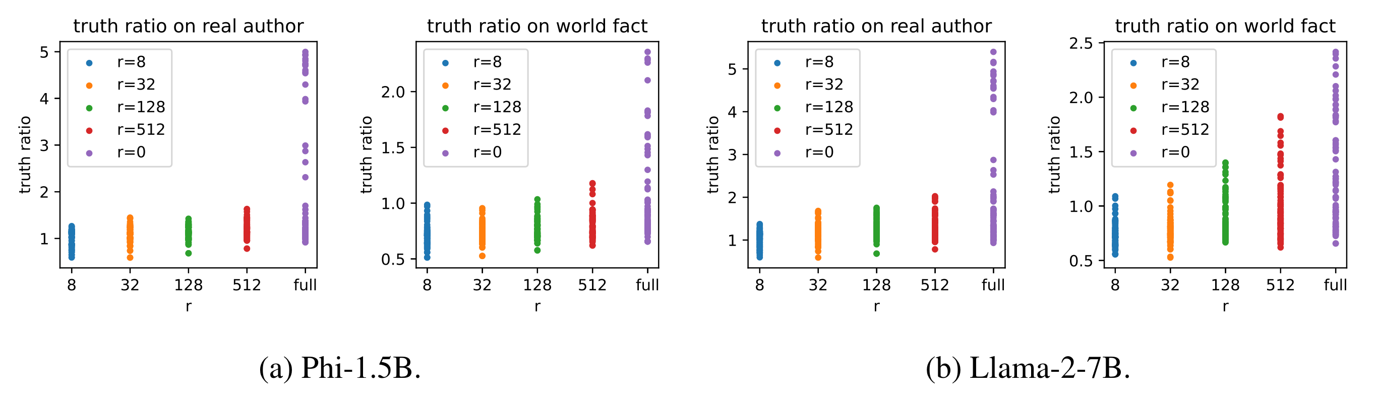 In Figure 4, we plot the truth ratio of models under different hyperparameters. We observe that after fine-tuning on new knowledge, larger ranks, especially full rank, perform better on old knowledge.